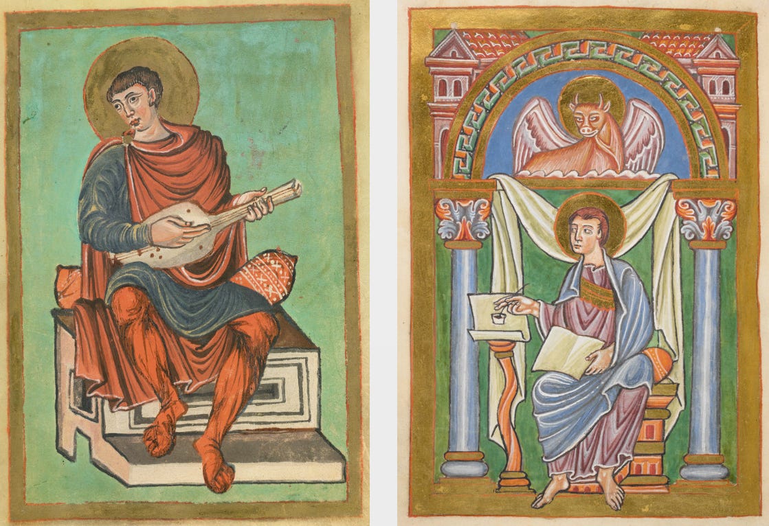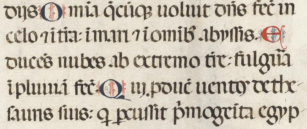 Carolingian minuscule was a product of this Renaissance, a synthesis of ancient Roman capitals and the lower-case (or “minuscule”, more properly) letters that had developed in various local handwriting styles in the interim. Created to be consistent, elegant, and easily legible to scholars around Europe, this wasn’t a script for everyday use by clerks and lawyers. It was meant to glorify and codify the word of God. Luxury Carolingian manuscripts such as the Ramsey Psalter below show how comfortably this writing style extended and fit alongside classical aesthetics.